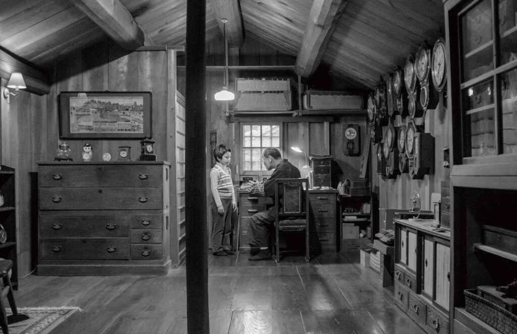 映画初出演とのことですが、三世桐竹勘十郎のもはや演技という範疇を超えたような存在感が凄いです。語り口とそのたたずまいに、必ず誰もが心奪われるでしょう。これ以上の適役はあり得ないと思わせるまでに梅本老人その人になっていて、そのセリフの語り口は一言一言を思わず頭の中で反芻してしまうほどの心地よさ。閑散とした昼間の御所の街並み、まるでモノクロのリアルな風景画のような背景を横切って梅本老人が歩く、ただそれだけのシーンに圧倒的な感動があります。映画とはこういうものだったと改めて気づかされると言えばいいでしょうか。