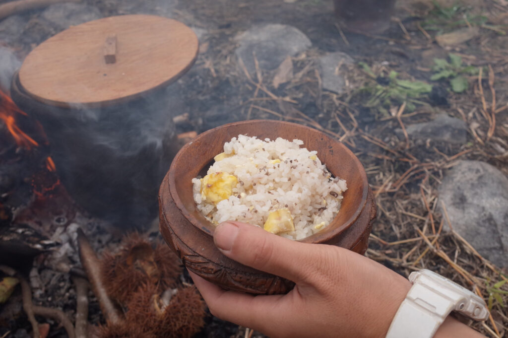 夕食は縄文土器でアワ粥とイノシシのスープをつくった。