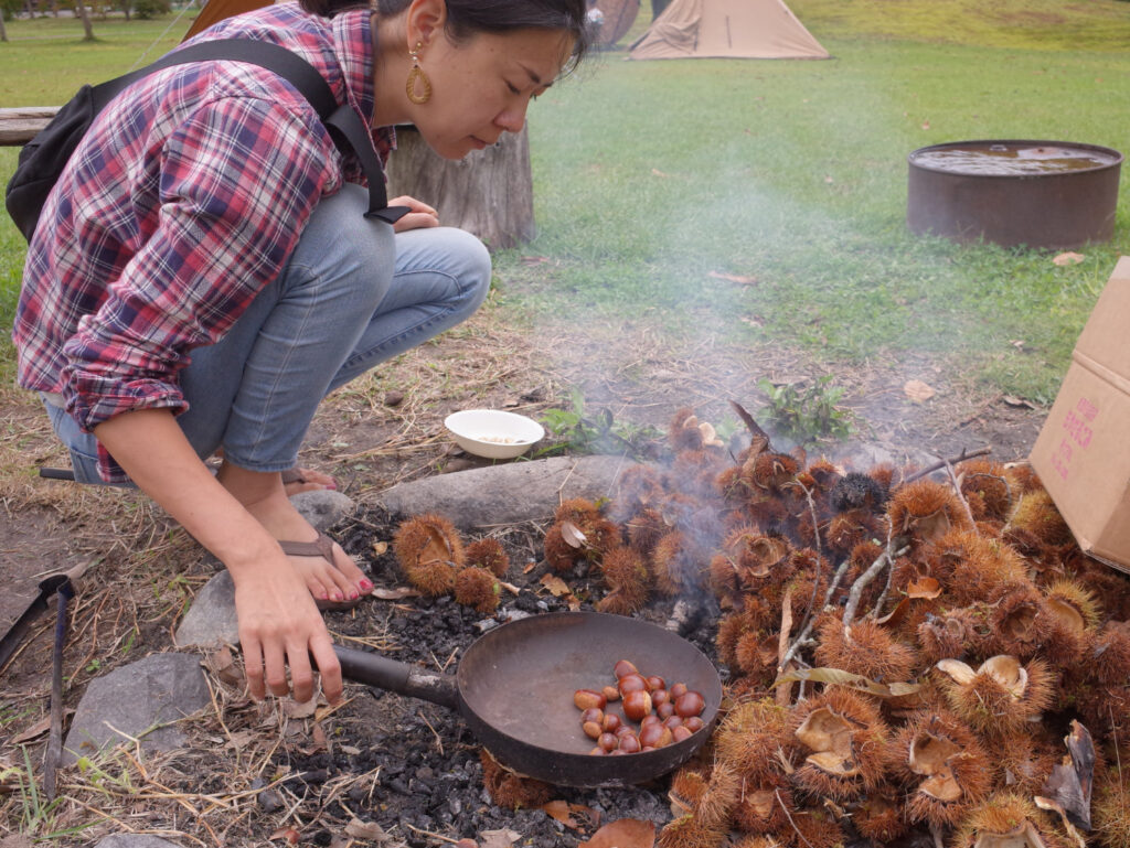 栗の実ははじけないように穴をあけてから煎ったり焼いたりする。