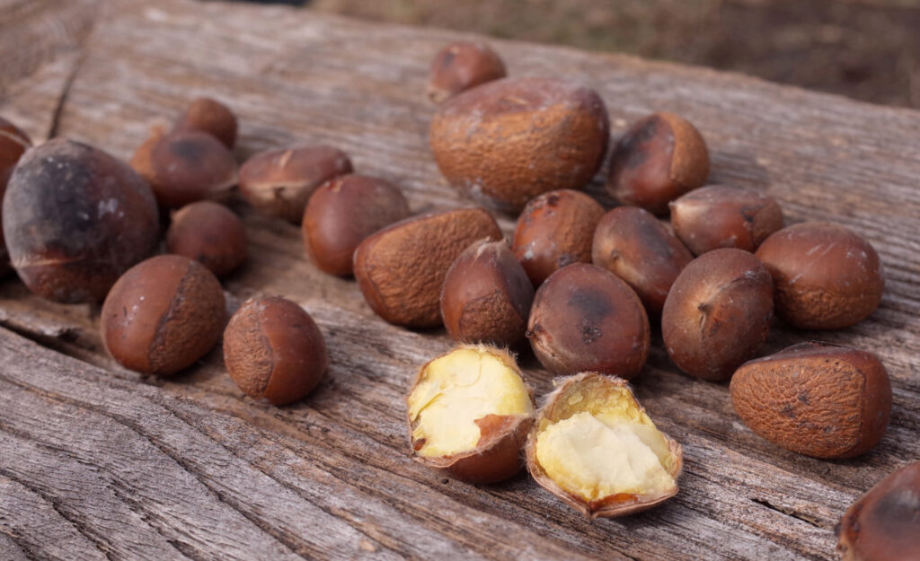 真脇遺跡は、縄文人も食べていた野生種のシバグリ(山栗)が豊富だ。