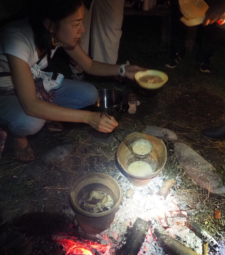 夕食は縄文土器でアワ粥とイノシシのスープをつくった。