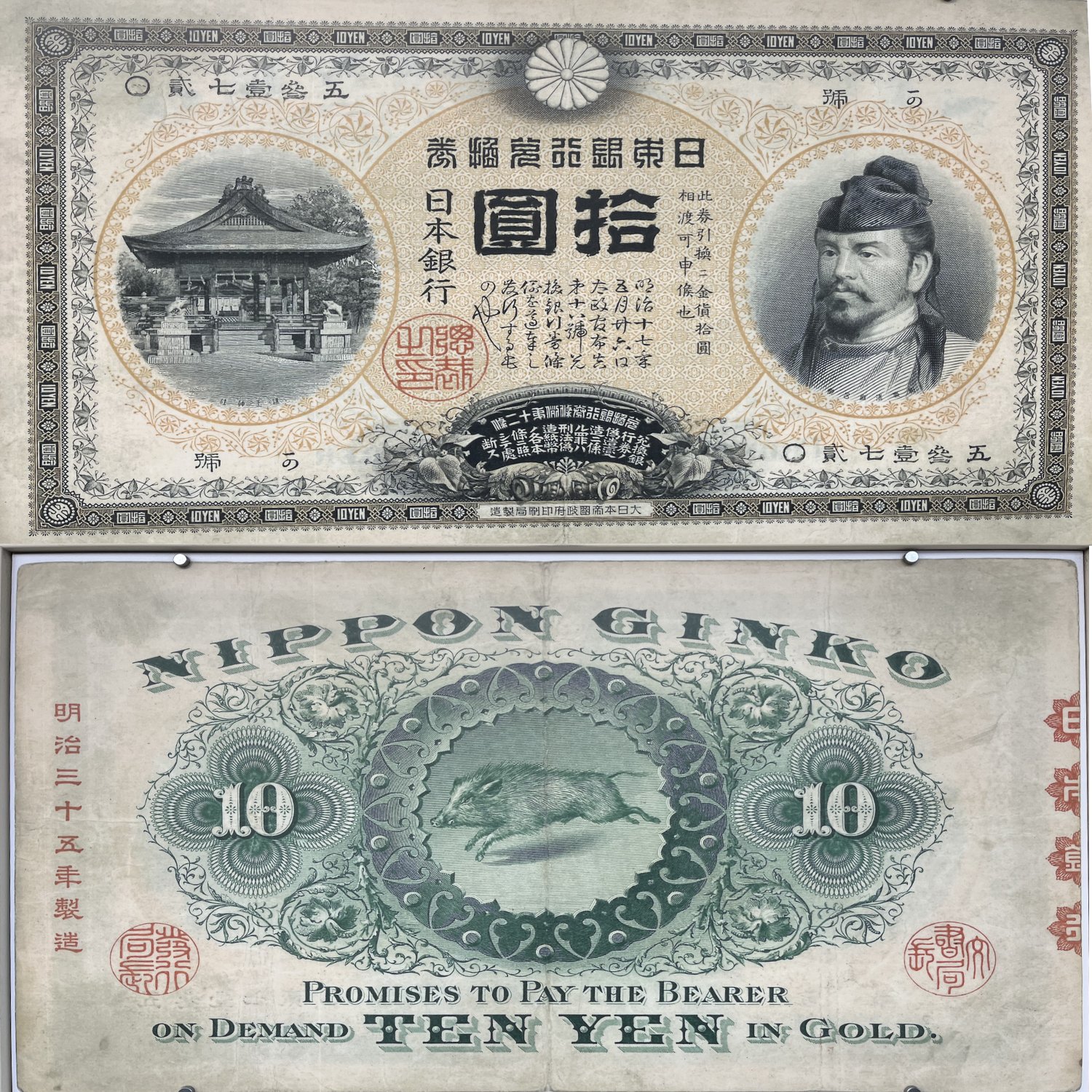 護王神社の外壁には明治時代の10円札の写真がある。金兌換制度に移行したあとに発行された1899年の甲10円券には、和気清麻呂や神社の拝殿がえがかれ、裏面には疾走する猪があしらわれている。
